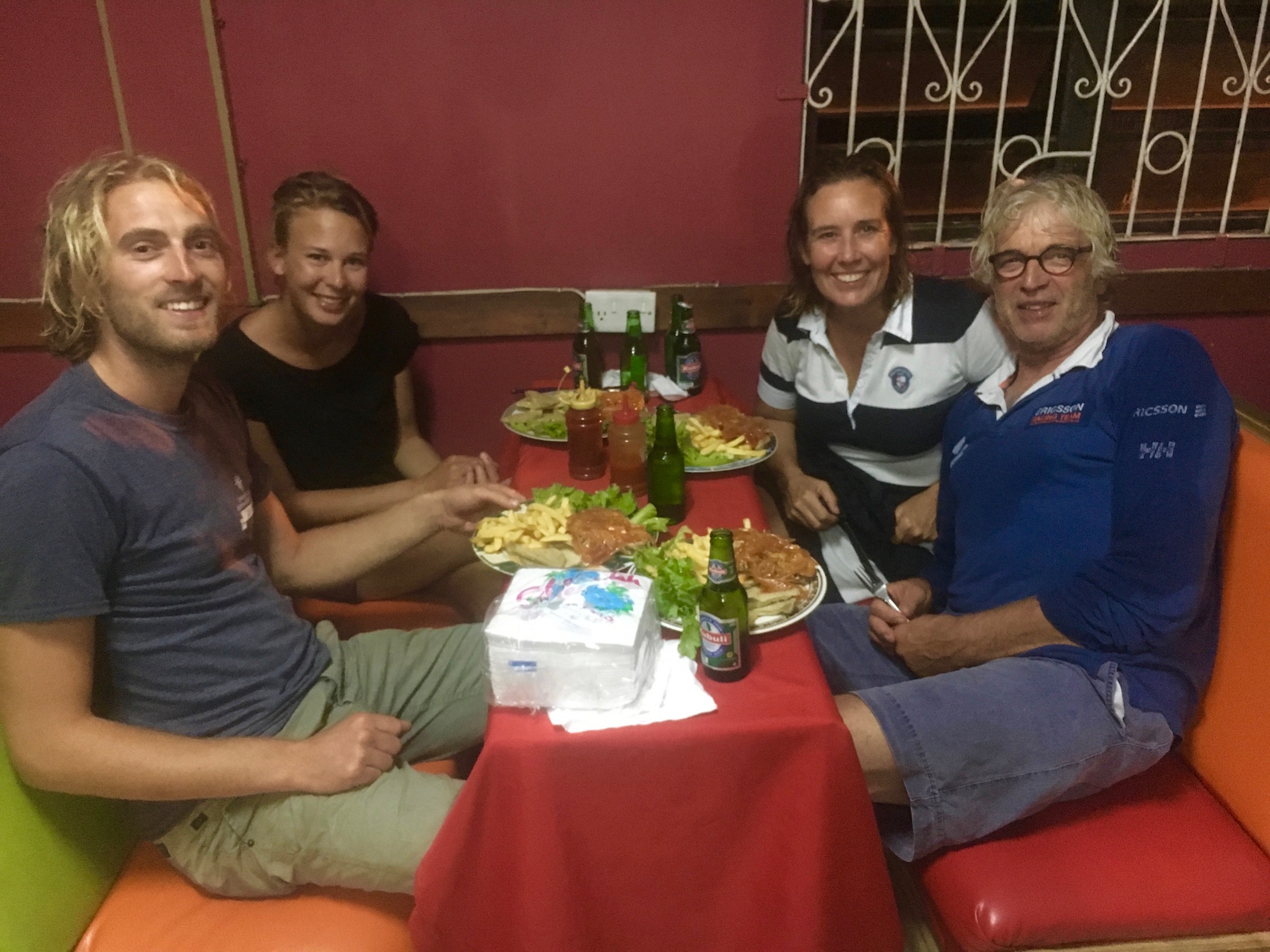 Lando nodigt ons uit om in een lokaal tentje tonijn te eten. Dat vinden we wel leuk, niet in de grote restaurants, maar we zitten in een soort plaatselijke snackbar, met alleen lokale mannen. En we eten gebakken tonijn met gebakken ui in ketchup, met frites en een blaadje andijviesla. En daarbij het lokale bier: “Kubuli”