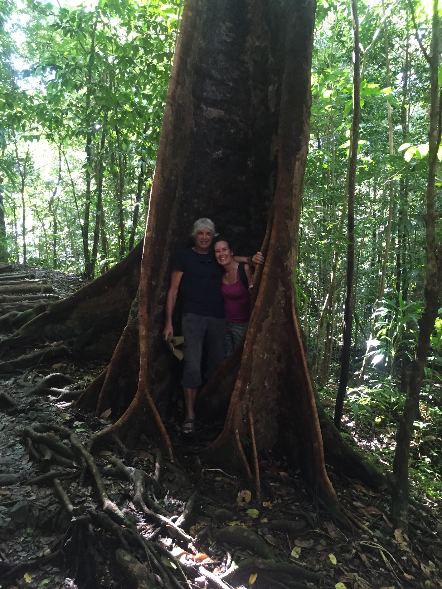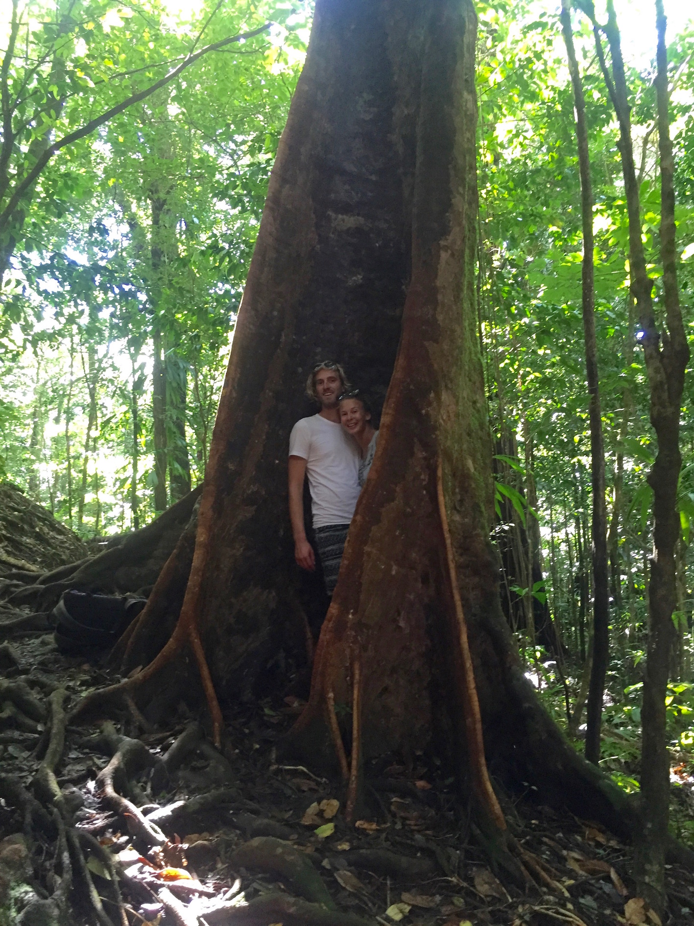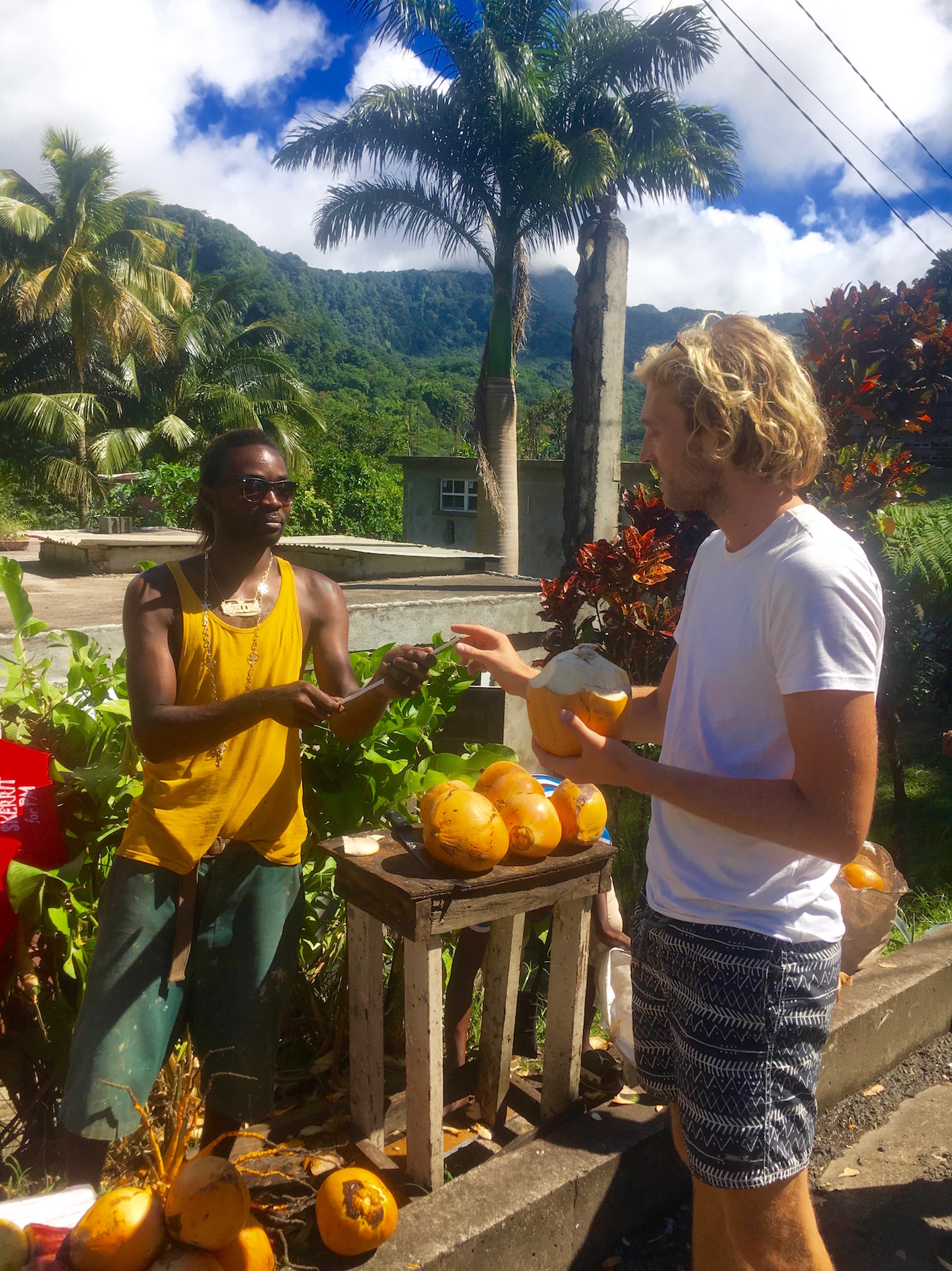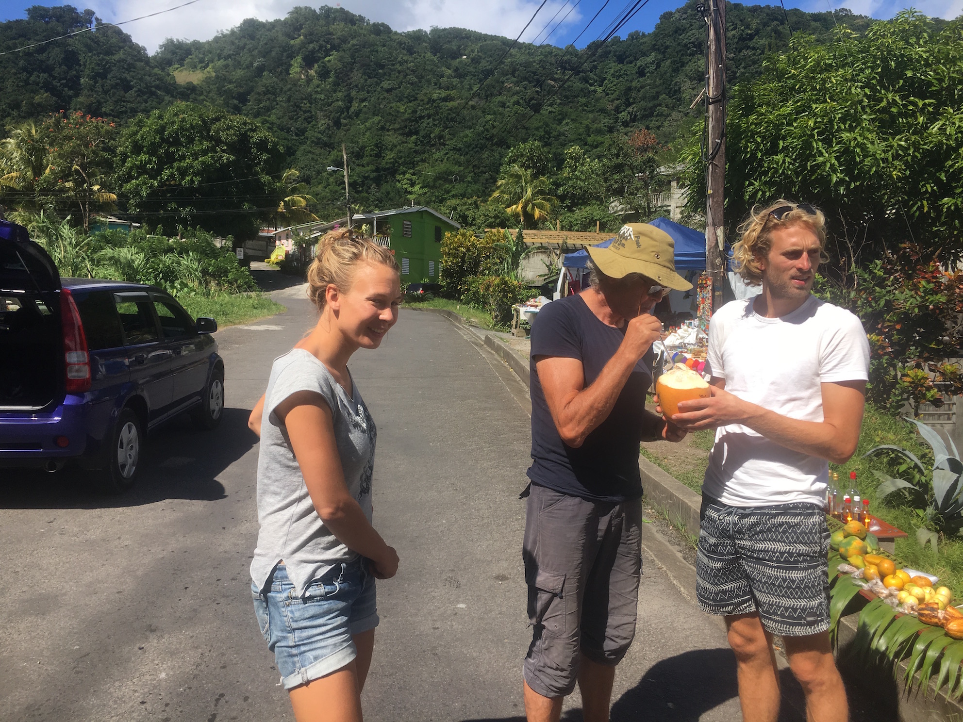 Michiel en Jits hebben een wandeling gevonden, die hen werd aangeboden door “Lando”. Deze man heeft met ons een wandeling door het groene oerwoud gedaan, met uitleg over alle planten. Op weg naar de plek van starten hebben we al een prachtige tour over een deel van het eiland, we stoppen bij een paar jongens die kokosnoten aan het verkopen zijn en kopen een paar kokosnoten om verse kokosnoten melk te drinken.