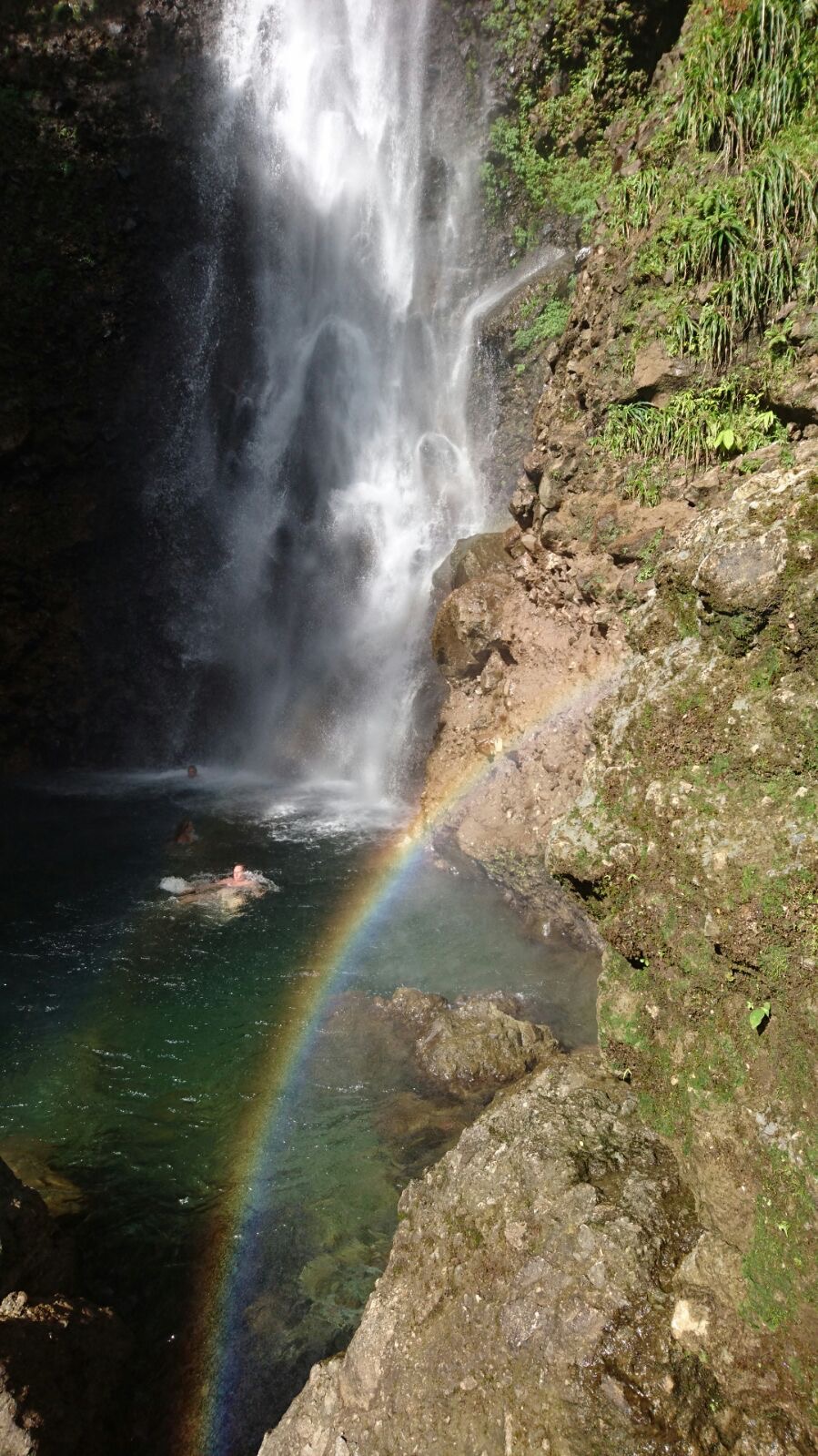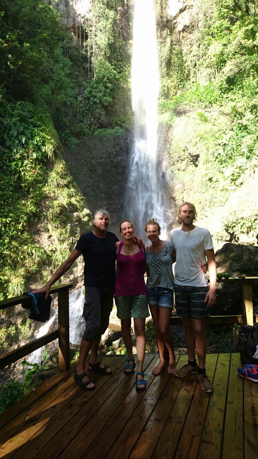 Daarna de wandeling van een klein uur naar de waterval. Eerst omhoog en daarna klimmen we naar beneden naar de waterval. Wat een schoonheid, je kan tot onder de waterval zwemmen, heerlijk!