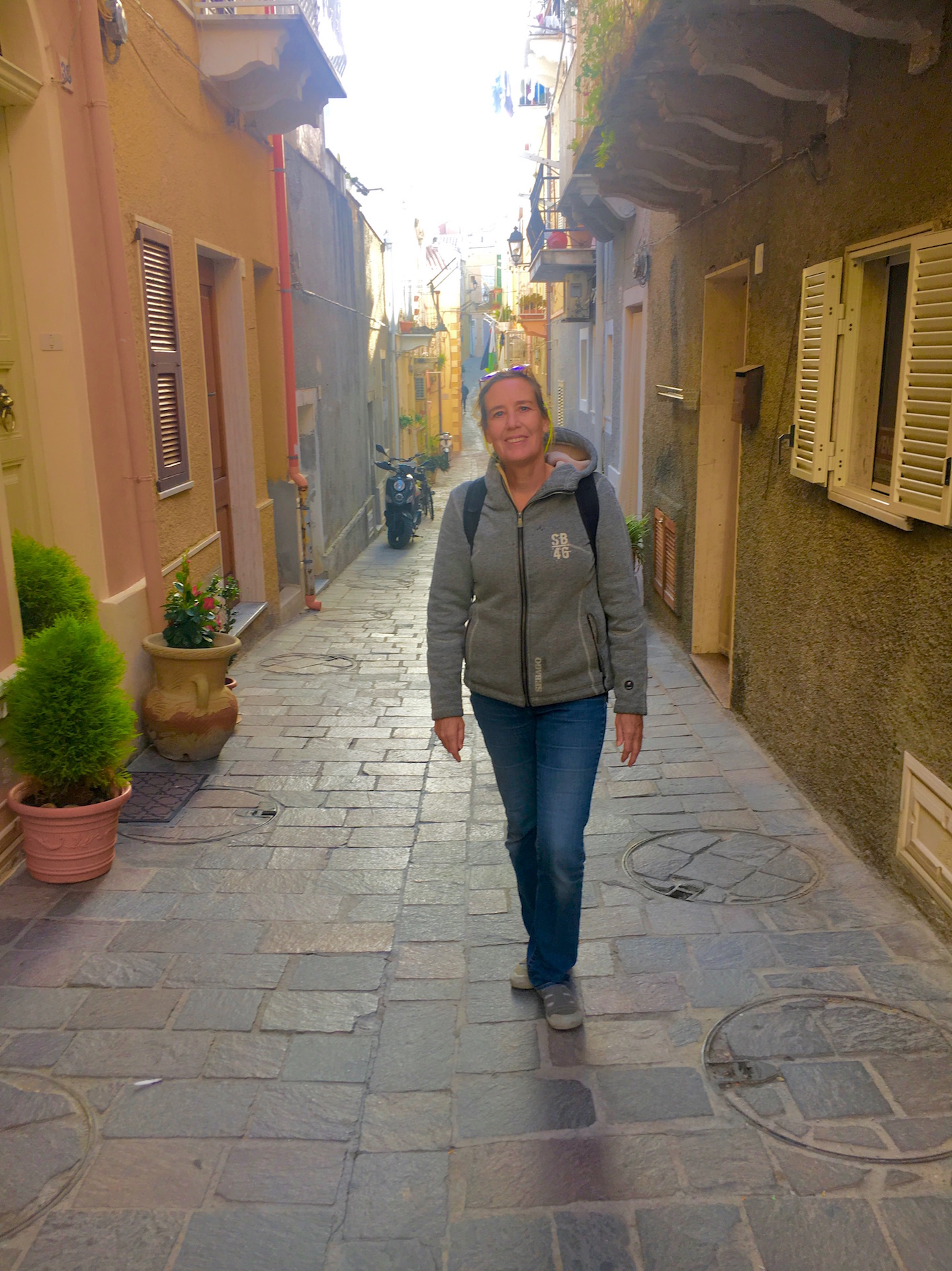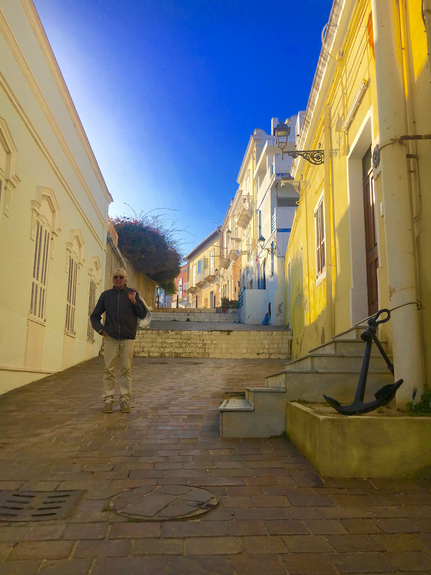 Op de 23e vertrekken we naar Sardinië, we denken dan nog naar Cagliari te gaan. De hele weg ontbreekt het aan wind. Wanneer we een zuchtje wind voelen, zetten we de zeilen op, maar het wil niet zonder de motor. Opvallend is wel dat de high aspect (de fok) niet goed meer in- en uit draait. Die moeten we later maar eens goed beoordelen als we in de haven zijn. We hebben tot aan onze eerste ankerplaats op Sardinië, nabij Capo Spartivento, alleen maar gemotord, wel 350 nmile lang! De ankerplaats is prachtig en rustig en de volgende ochtend gaan we de laatste 30 mijl naar het stadje Carloforte op het eiland San Pietro. Frank is hier 2 keer eerder geweest in 2003 en weet nog hoe bijzonder het eiland was. We leggen aan bij het stadje. Er is dan al een flinke noord westen wind en de havenmeester geeft aan dat dit de Mistral uit Zuid Frankrijk is. Die zal nog wel een paar dagen doorblazen en dan kunnen we beter wat later vertrekken naar Spanje. Frank weet nog precies waar de supermarkt is en daar kopen we allemaal heerlijke Sardijnse wijntjes, Italiaanse kaasjes en worstjes.