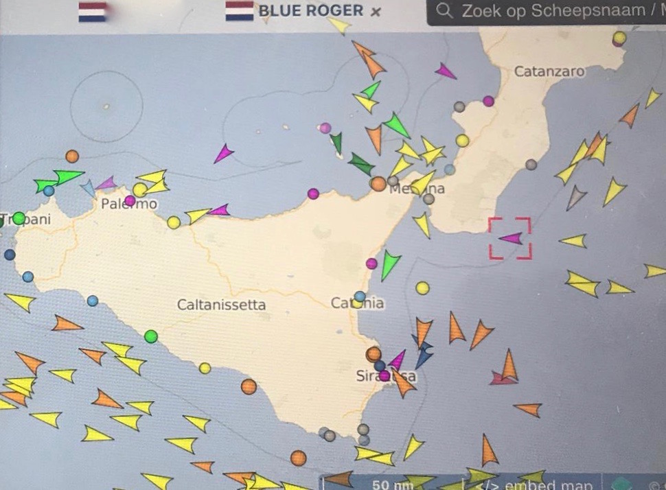 Wanneer we aankomen in de straat van Messina, de doorgang tussen Calabrië en Sicilië, kruisen we de plek waar Michiel met zijn vrienden in 2014 de Blue Roger van Croatië naar Spanje heeft gebracht. Op dat moment is de Blue Roger dus werkelijk 1x de wereld rond!!! Nu wij nog….